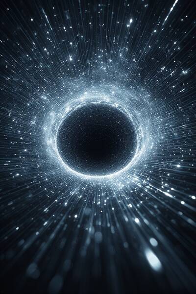 Ein Schwarzes Loch ist keine gewöhnliche Leere, sondern eine Region, in der die Raumzeit selbst an ihre Grenzen geführt wird. Nichts, nicht einmal das Licht, kann seinem Griff entkommen. Für den Beobachter draußen scheint die Zeit am Rand des Schwarzen Lochs stillzustehen: Alles, was hineinstürzt, verlangsamt sich und „friert“ wie ein eingefangenes Bild ein. Für denjenigen jedoch, der selbst den Sturz erlebt, vergeht die Zeit normal – und doch führt sie unaufhaltsam auf die Singularität zu, jenen geheimnisvollen Punkt, an dem Raum und Zeit ihre vertraute Bedeutung verlieren - die Raumzeit steht still.